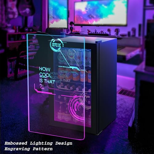 HCK 126 Can Beverage Refrigerator with Color Changing Door, Mini Gaming Fridge with Glass Door, Black Cyberpunk Beer Fridge LED Lighting Bar Fridge for Gaming Room 3.5 Cu.Ft.