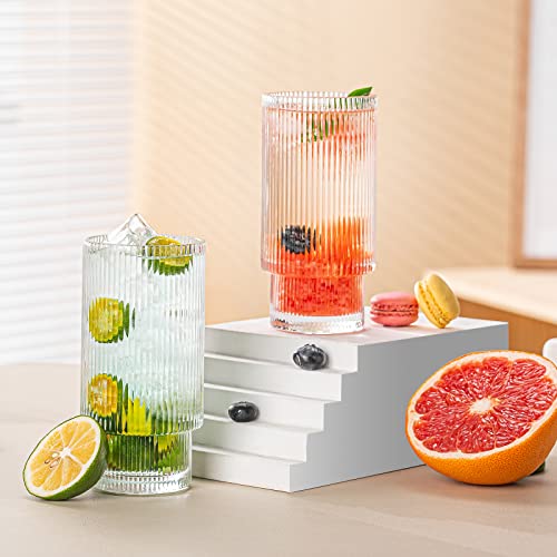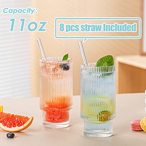 Drinking Glasses, Origami Style 6 pcs Glass Cups with straw, 11oz Highball Glasses, Elegant Ripple Vintage Glassware, Ribbed Glasses, Iced Coffee Glasses Ideal for Cocktail Whiskey, Juice